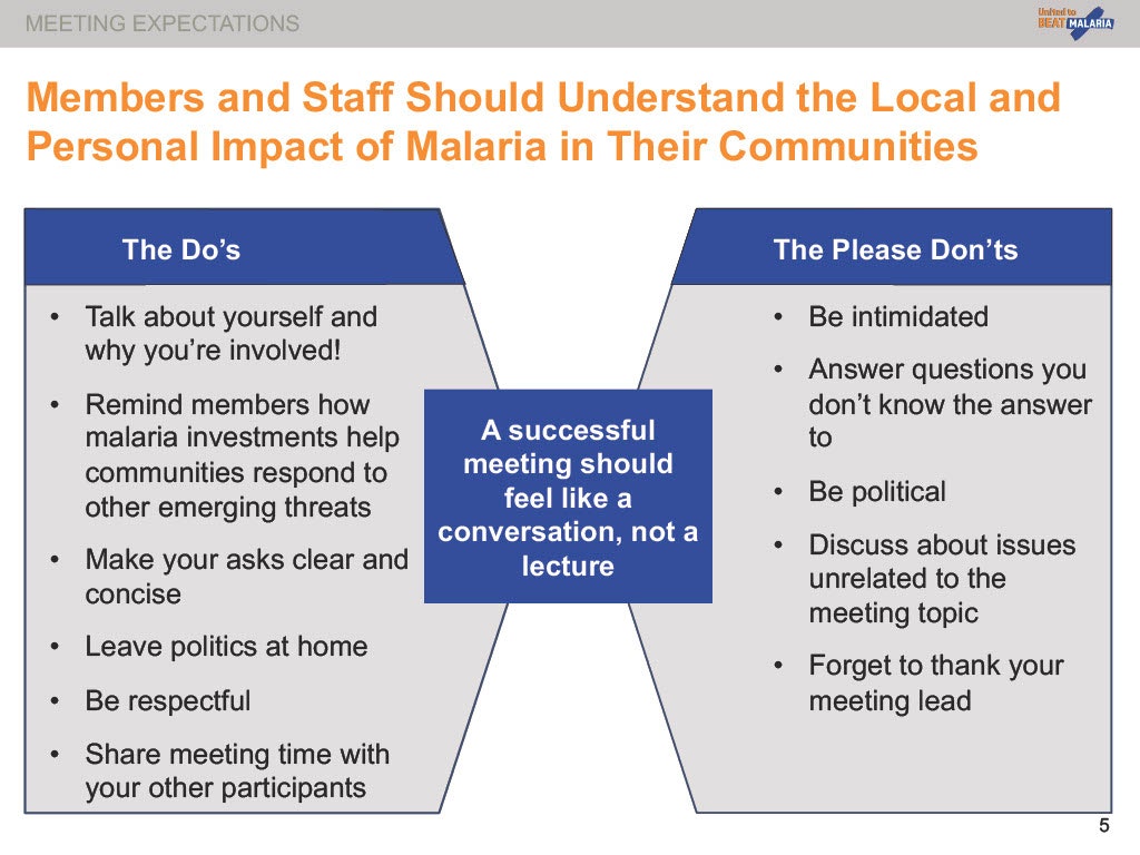 • Your audience will have varying degrees of knowledge. Before diving into talking points, make it a conversation; ask how familiar your meeting lead is with malaria.